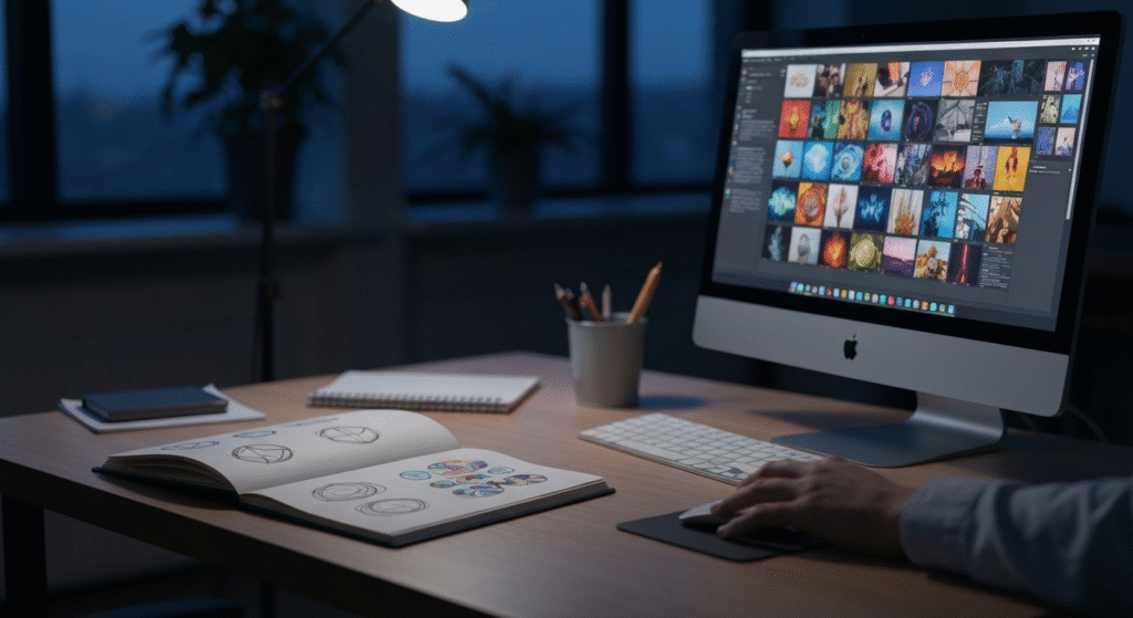 - Phase 1: Concept Exploration with AII started by feeding an AI image generator prompts that combined architectural terms with branding concepts. For instance, “Art Deco hotel logo, minimalist, gold and navy blue, clean lines.” In under an hour, I had over 50 unique visual starting points. This included logo marks, typography pairings, and pattern ideas.